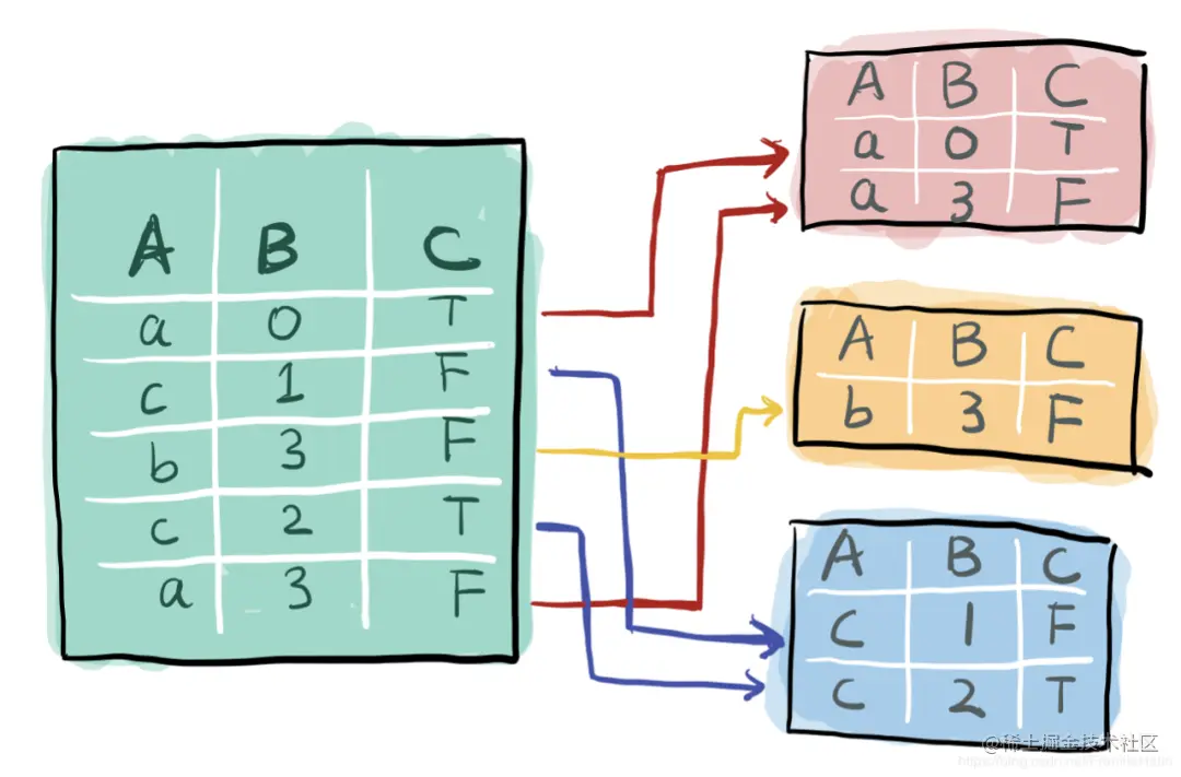 主要用途:查看相同键时行的某些变化,如例子中在A相同时B、C的变化。