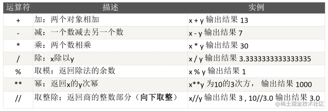算数运算符包括:+、-、*、/、//、%,以下假设变量 x=10,y=3