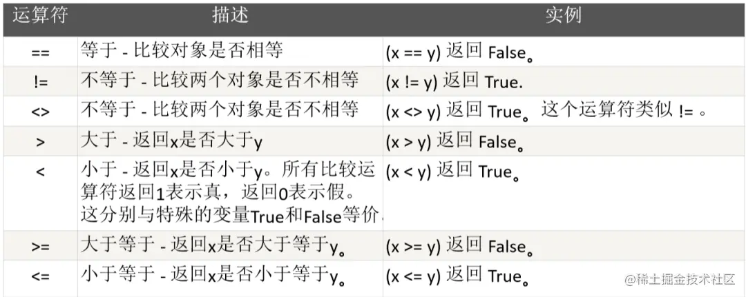 比较运算的结果为 True 或 False,以下假设变量 x=10,y=3