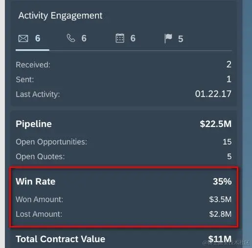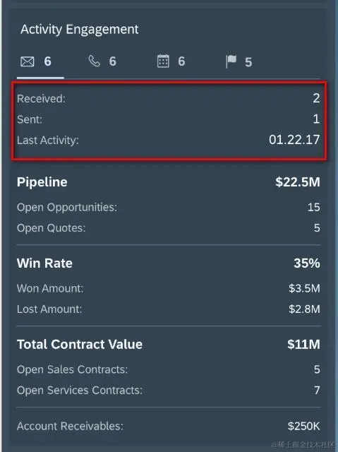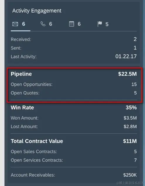 SAP C4C的Insights标签会显示和该客户相关的销售漏斗涉及的总金额,以及当前处于正在进行中的销售机会数和销售报价单个数。