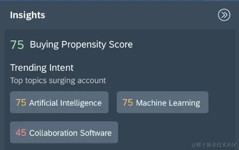 SAP C4C会将某个客户总的Surge分数显示在屏幕右侧Insights面板内,同时显示出Surge分数最高的前三个话题。下图Surge分数前三的话题依次为:Artificial Intelligence, Machine Learning和Collaboration Software。