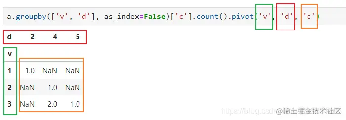 我的要干的事情 就是把这个v当作列index,d当作行columns,之后把对应的分组的’c‘.count()放到对应的索引loc处,不存在的值用0填补。