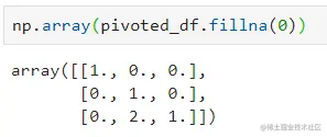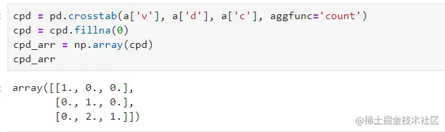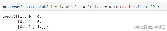 np.array(pd.crosstab(a['v'], a['d'], a['c'], aggfunc='count').fillna(0))