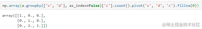 np.array(a.groupby(['v', 'd'], as_index=False)['c'].count().pivot('v', 'd', 'c').fillna(0))
