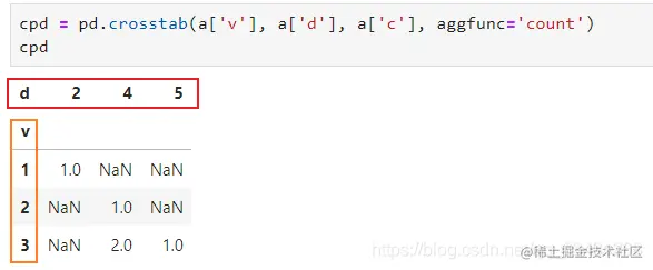 cpd = pd.crosstab(a['v'], a['d'], a['c'], aggfunc='count')
