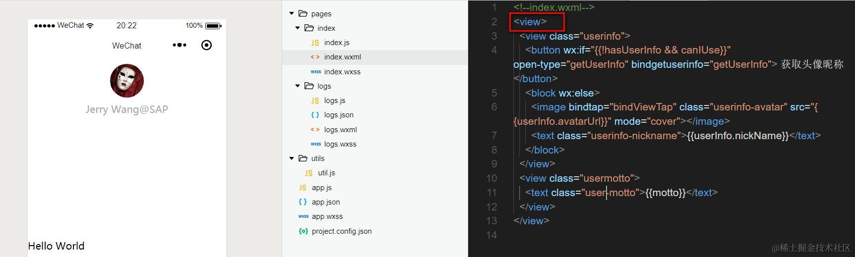 第三行: view元素可以嵌套,相当于原生HTML里的div元素。此处定义了另一个view元素,css类为userinfo。这个css类不是微信提供的,而是我们自己开发的,位于文件index.wxss里: