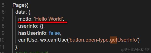 纯文本元素,显示的文本绑定到数据模型motto上。这个模型字段motto硬编码成Hello World,所以我们最后在小程序上看到显示的“Hello World"。