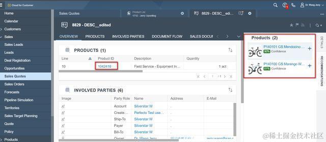 现在我们来做个测试,创建一个新的销售报价单,将之前维护在Product List的某一个产品,比如1042416,维护在这个销售报价单的行项目里,然后C4C系统自动给我推荐了两个其他产品,ID为P140101和P140100。