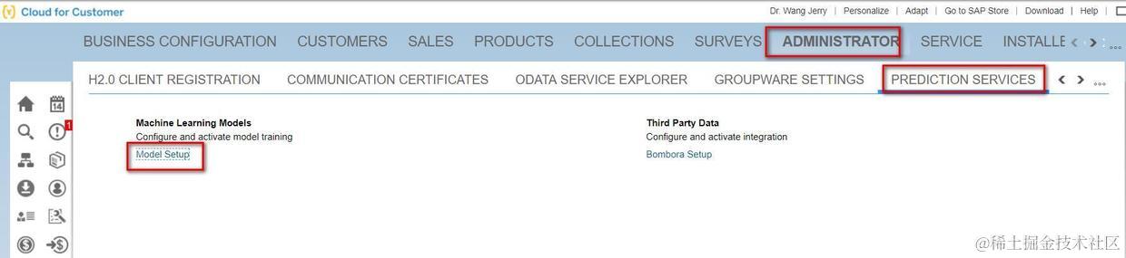 下面我们一起来看看人工智能在产品推荐这个场景里的具体实现吧。还是先去Administrator->Prediction Services,点击Model Setup进行机器学习的模型设置。