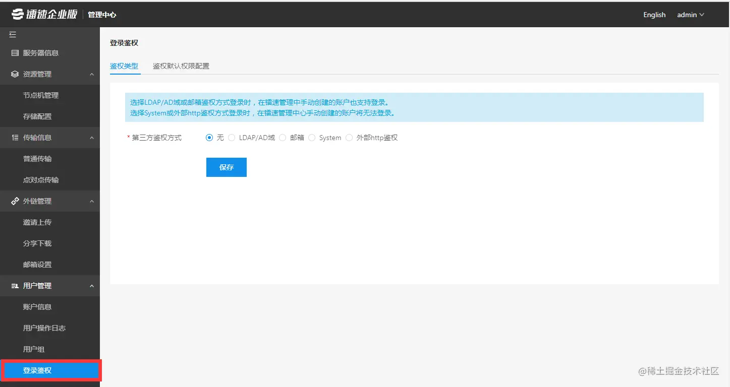 支持鉴权镭速系统用户、AD域用户、邮箱用户、linux系统用户、外部http鉴权用户,为企业级用户提供更好的导入用户操作;用户在前端登录只需要输入自己的AD域、邮箱、linux系统账号密码或外部http鉴权用户账号密码即可登陆镭速系统。