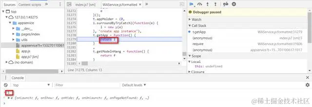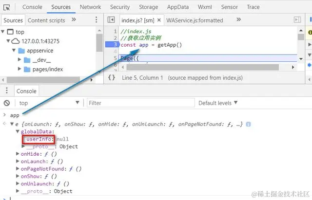 为什么这个app实例如此重要,以至于放到控制器的第一行代码来创建呢?我们直接在调试器里输入app然后回车,能看到这个app对象里包含了globalData这个属性和很多有用的方法。