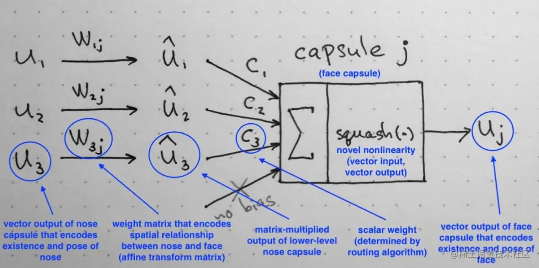 输入为较为低层次的胶囊(Primary Capsule) ,其中, 表示胶囊的个数, 表示每个胶囊内的神经元个数(向量长度)。图中的 可以解释为监测到眼睛、嘴巴、鼻子三个低层次的胶囊。