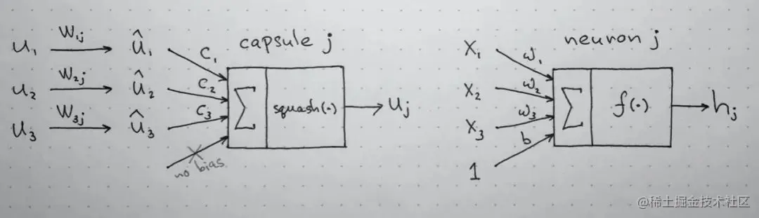 最后一步的向量通过非线性函数squash,这确保了向量的方向保持不变,但它的长度被强制不超过1。这一步输出最终的向量