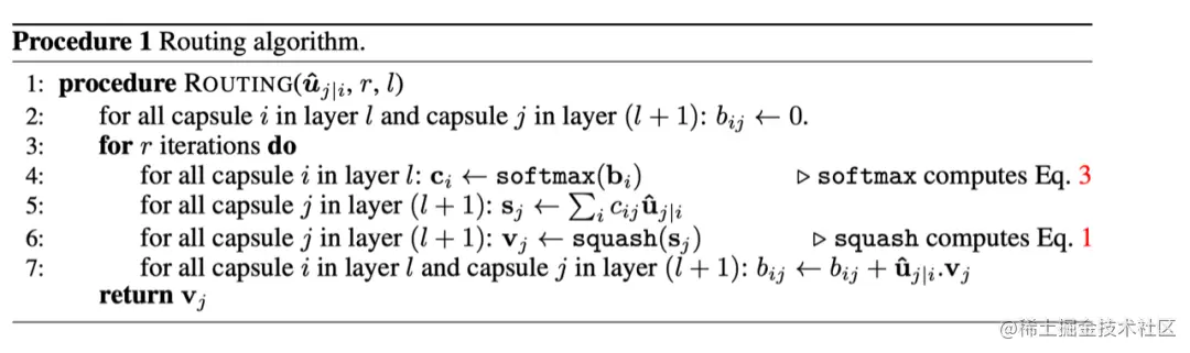 对于上述的学习参数 是通过迭代的动态路由算法进行更新,以下是原文对动态路由算法的描述: