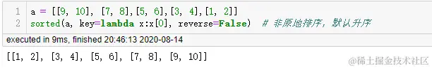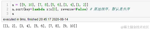 使用 sort 方法进行排序,以第二个值进行升序排序,列表的 sort 方法是原地排序