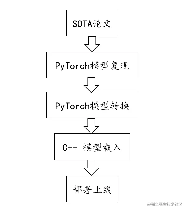 通过前面对TorchScript和libtorch的描述,其实我们已经基本将PyTorch的C++部署已经基本讲到了,这里我们再来完整的理一下整个流程。基于C++的PyTorch模型部署流程如下。
