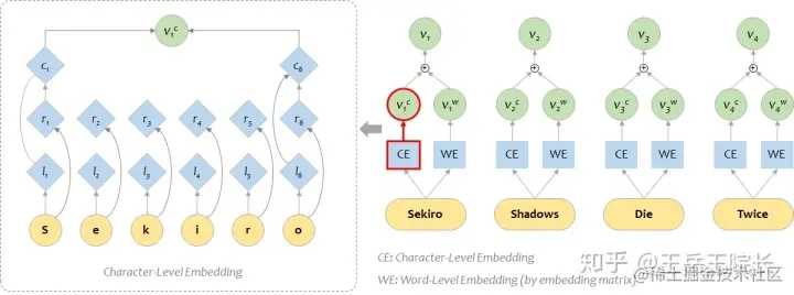 在英文 NLP 任务中,想要把字级别特征加入到词级别特征上去,一般是这样:单独用一个BiLSTM 作为 character-level 的编码器,把单词的各个字拆开,送进 LSTM 得到向量 vc;然后和原本 word-level 的(经过 embedding matrix 得到的)的向量 vw 加在一起,就能得到融合两种特征的表征向量。如图所示