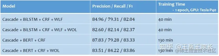 所以沿着上述思路,就在一个中文NER任务上做一些实践,写一些模型。都列在下面了,首先是 LSTM-CRF 和 BERT-CRF,然后就是几个多任务模型, Cascade 开头的(因为实体类型比较多,把NER拆成两个任务,一个用来识别实体,另一个用来判断实体类型),后面的几个模型里,WLF 指的是 Word Level Feature(即在原本字级别的序列标注任务上加入词级别的表征),WOL 指的是 Weight of Loss(即在loss函数方面通过设置权重来权衡Precision与Recall,以达到提高F1的目的),具体细节后面再讲