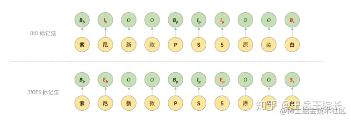 这里说一下用于表示序列标注结果的 BIO 标记法。序列标注里标记法有很多,最主要的还是 BIO 与 BIOES 这两种。B 就是标记某个实体词的开始,I 表示某个实体词的中间,E 表示某个实体词的结束,S 表示这个实体词仅包含当前这一个字。区别很简单,看图就懂。一般实验效果上差别不大,有些时候用 BIOES 可能会有一内内的优势
