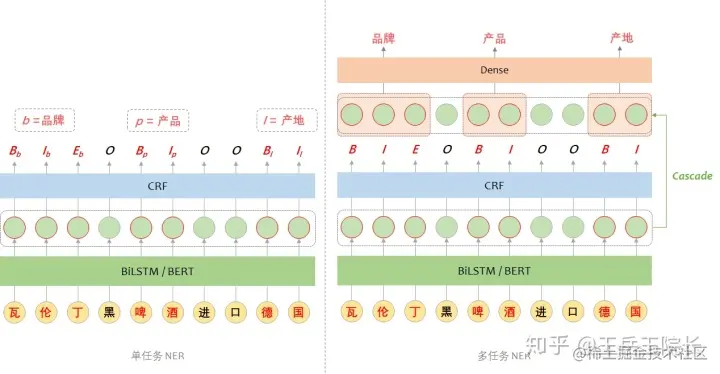 从这个点出发,就尝试把 NER 改成一个多任务学习的框架,两个任务,一个任务用来单纯抽取实体,一个任务用来判断实体类型,直接上图看区别