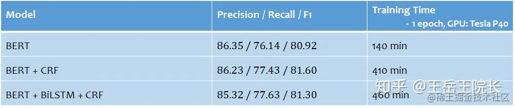 相比较单纯使用 BERT,增加了 CRF 后效果有所提高但区别不大,再增加 BiLSTM 后区别很小,甚至降低了那么一内内