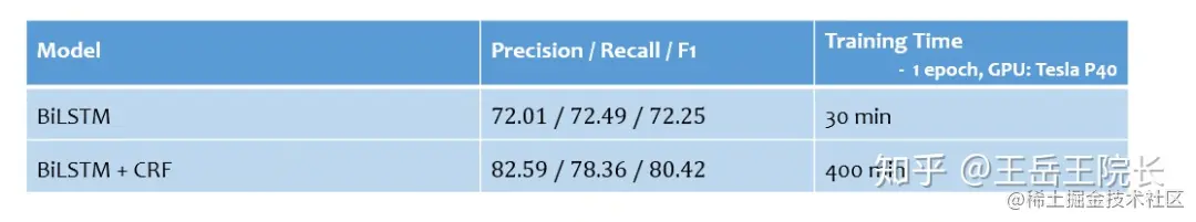再说一下为什么要加 CRF。从开头的 Leaderboard 里可以看到,BiLSTM 的 F1 Score 在72%,而 BiLSTM+CRF 达到 80%,提升明显