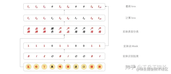 具体实现上这样写:在训练时,每个词,无论是不是实体词,都过一遍全连接,做实体类型分类计算 loss,然后把非实体词对应的 loss 给 mask 掉;在预测时,就取实体最后一个词对应的分类结果,作为实体类型。上图解释