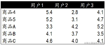 在基于用户的算法中,我们的流程是:推荐给用户C->寻找与用户C相同爱好的用户->寻找这些用户购买的其他商品的加权打分。