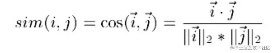 通过计算两个向量之间的夹角来计算物品的相似度。因为不同的用户可能有不同的性格,可能有一个人给什么东西打分都很高,另外一个人给什么东西打分都低,这样的话使用Pearson系数会判定这两个人偏好不同,而向量余弦会更加关注用户给不同商品打分的相对情况。(PS:其中分子为两个向量的内积,即两个向量相同位置的数字相乘。)
