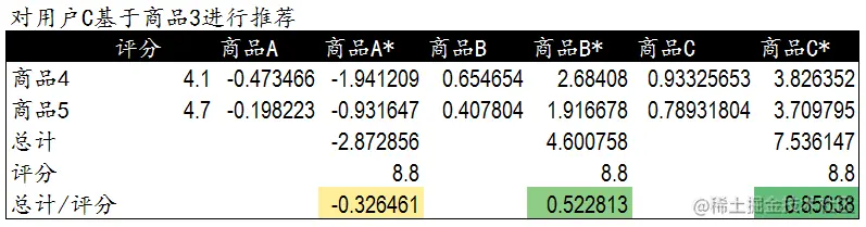 现在我们找到了用户D和E买过的其他的商品A,B,C,D,E,F。然后让用户D和E与用户C的相似度作为权重 ,计算他们给这些商品打分的加权分数。然后给C按照加权分数从高到低进行推荐。