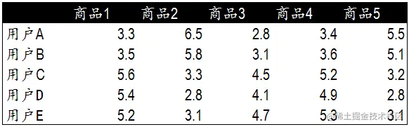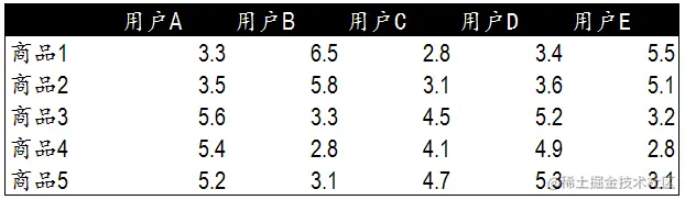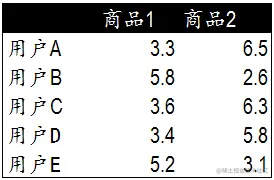 现在考虑一种最简单的情况,5个用户都购买了两种商品,然后并对商品进行打分,如下图:
