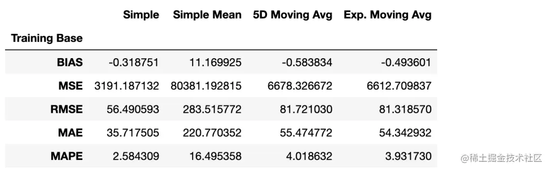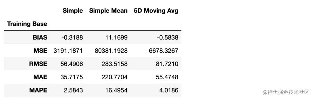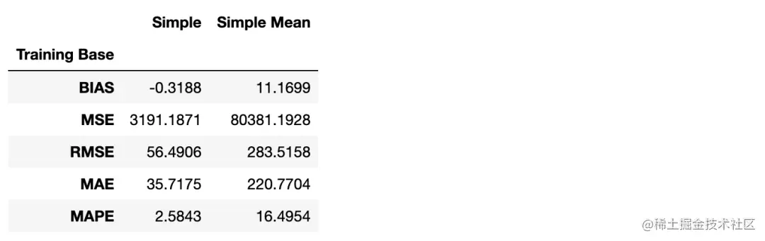 此模型使用数据首端直到分析的前一个时期的平均值,并且按天扩展到数据结束,最后,趋势是一条直线,我们现在将此模型与第一个模型的误差进行比较: