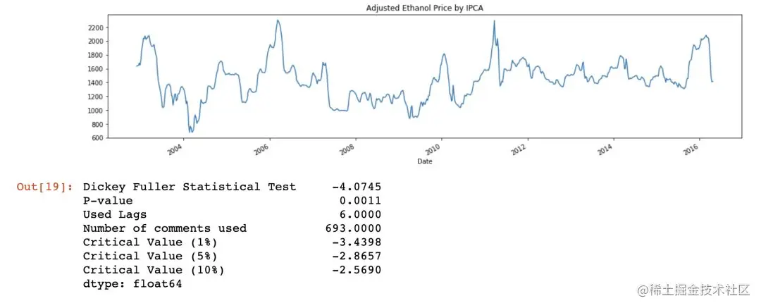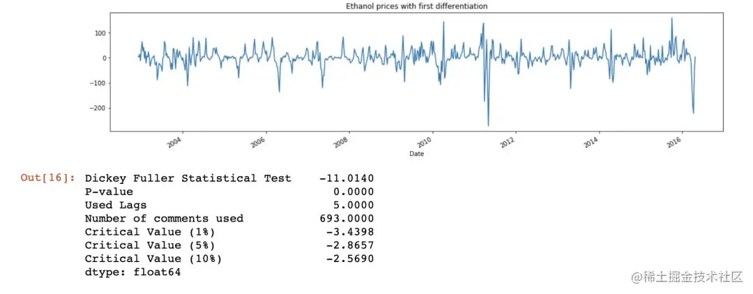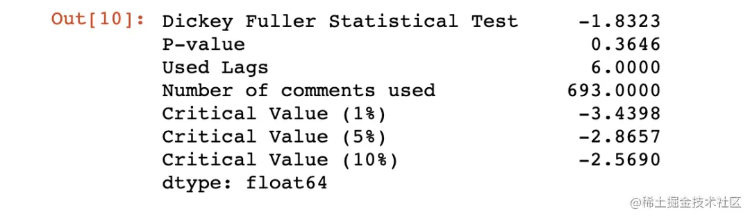 我们来做一下 Dickey-Fuller 测试,看看这个序列是否会在一阶微分后是平稳的: