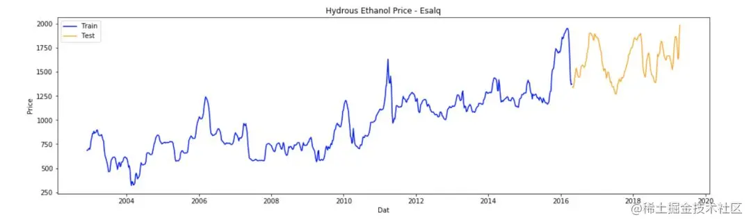 在本例中,我们有Esalq 含水乙醇的 856 周的价格数据,使用前 700 周的数据作为训练集,后 156 周(3年,18%)的数据用作测试集: