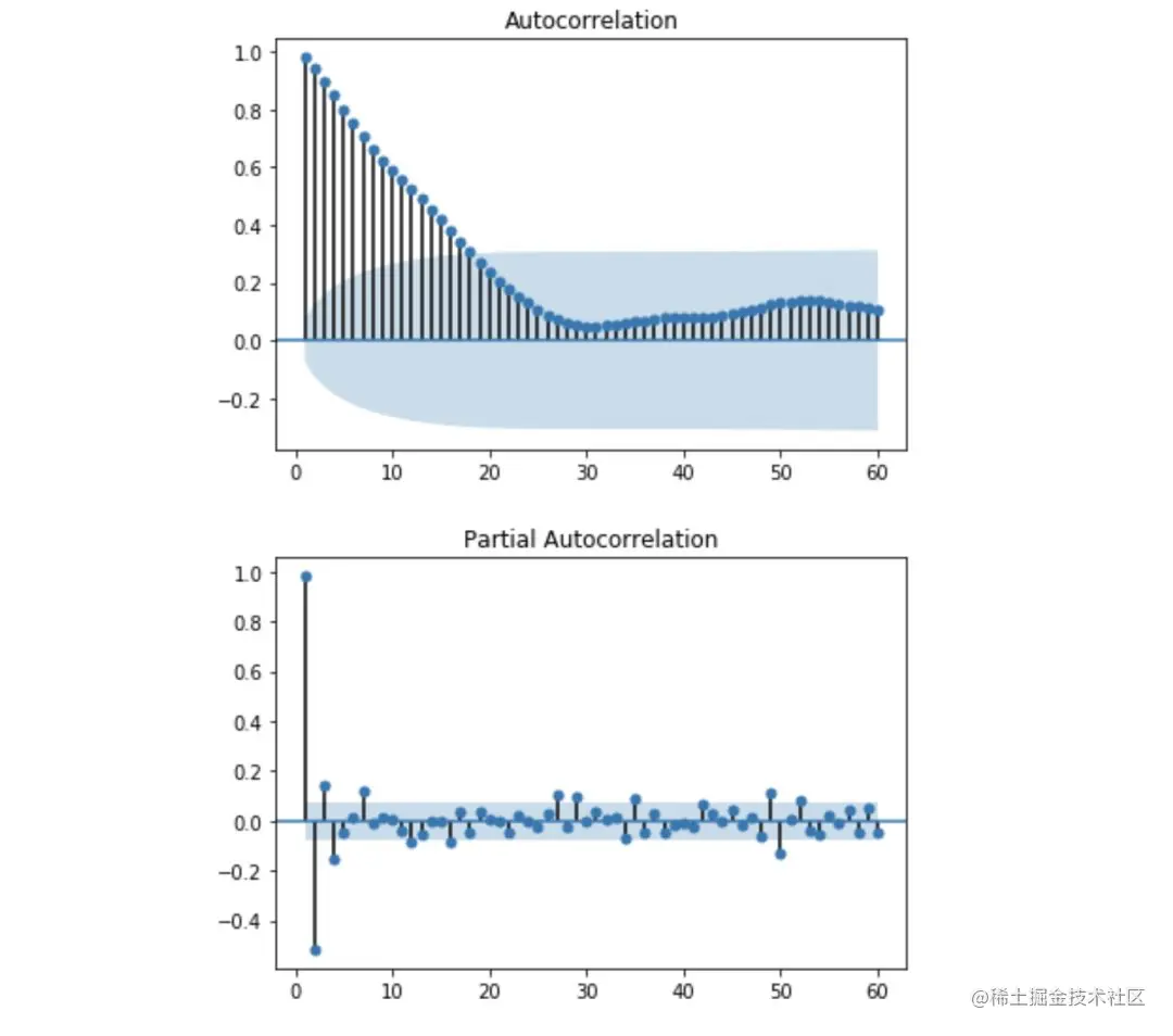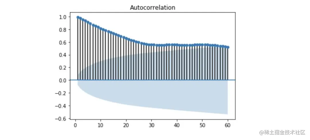 由于这个序列每周为一周期,1 年大约 52 周,我将使用 60 的滞后期的自相关函数来验证当前周期与这些滞后的相关性。