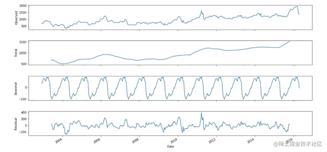 每一个时间序列可以分为三个部分:趋势、季节性和残差,残差是将前两部分从序列中去除后剩下的部分,使用这种分割方法之后: