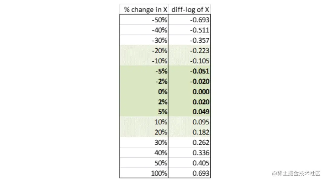当我们对这些价格中使用 NL 时,我们得到:NL (52.50) - NL(50.00) = 3.96 - 3.912 = 0.048 或 4.8%,同样地,在第二个价格序列中使用 LN 时,我们得到:NL (105) - NL(100) = 4.654-4.605 = 0.049 或 4.9% 。