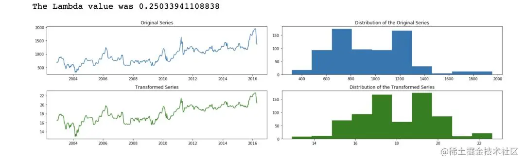 接下来我将绘制原始序列及其分布图,然后用 lambda 最佳值绘制新的转换序列及其分布图,为了找到 lambda 的值,我们将使用库 Scipy 的 boxcox 函数生成转换的序列和理想 lambda 值:
