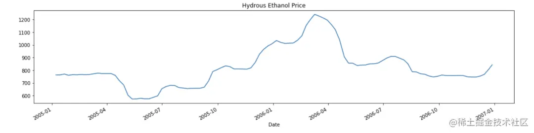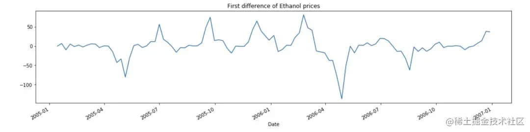 为了更容易理解,下面我们只用一小部分的乙醇价格,以便更好地可视化,可以看到从 2005 年 5 月开始价格上涨,直到 2006 年 5 月中旬,价格每周都在上涨,这就累积了一个上升的趋势,这种情况下,属于非平稳序列。
