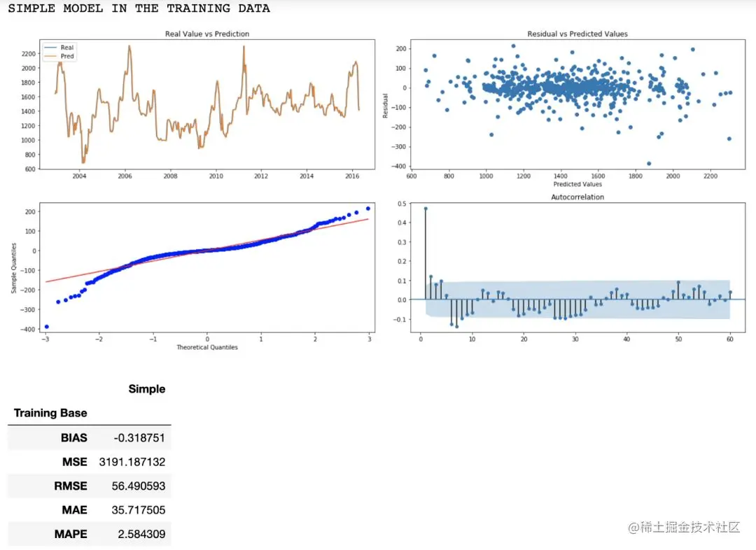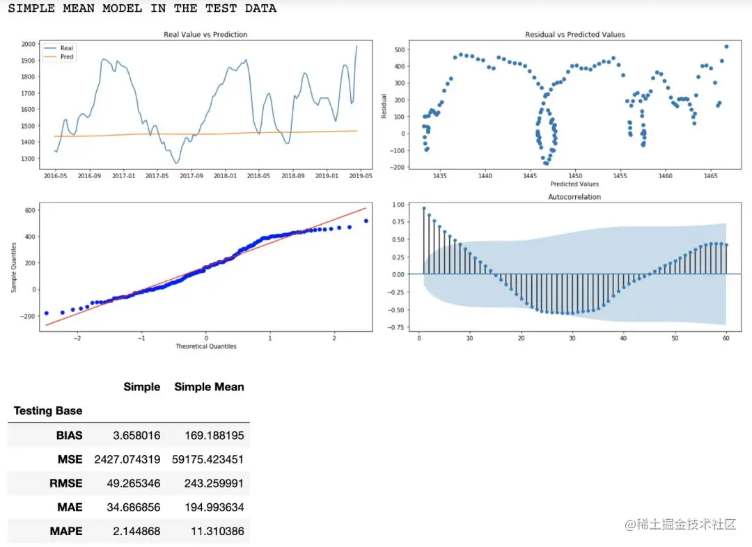 简单均值模型无法捕获序列的相关信息,如真实值和预测值图中所示,也可以在相关性和残差和预测图中看到。