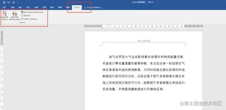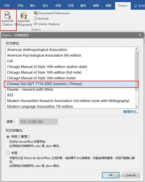1. Word中点击菜单栏中的“Zotero”工具栏→选择要引用的方式(默认选项没有的引用方式参见第六部分)