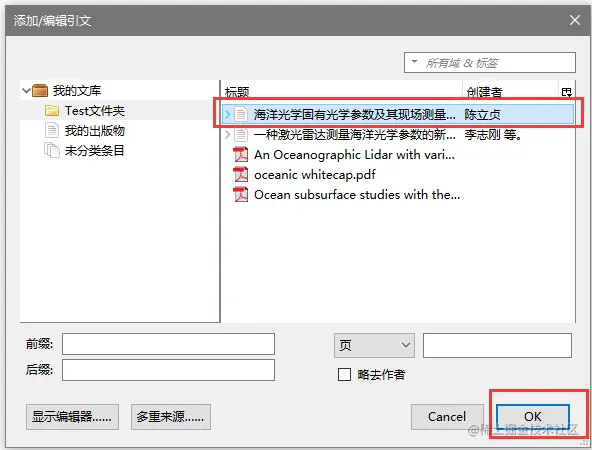 3. 出现“添加/编辑引文”对话框→选择要引入的文献,点击OK