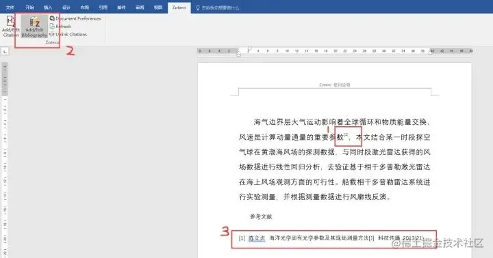 4. 下图1处出现上角标→光标置于参考文献3处→点击2处→3处引入参考文献成功
