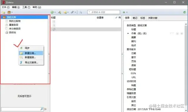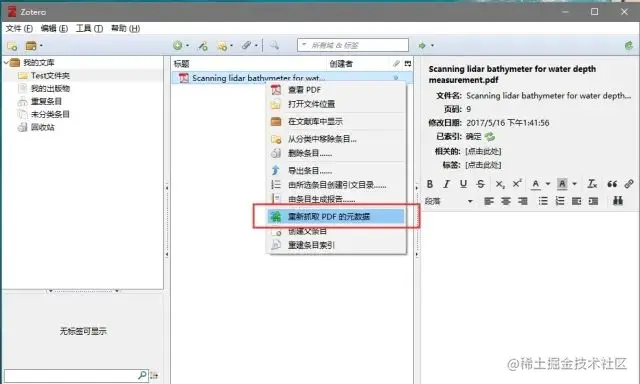 在新建目录下→鼠标拖入英文文献→右键重新抓取PDF文件的元数据→获取文献基本信息(一般情况下拖进pdf时候就自动抓取元数据)
