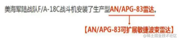 命名实体链接主要目标是进行实体消歧,从实体指代项对应的多个候选实体中选择意思最相近的一个实体。这些候选实体可能选自通用知识库,例如维基百科、百度百科,也可能来自领域知识库,例如军事知识库、装备知识库。图3给出了一个实体链接的示例。短文本“美海军陆战队 F/A-18C战斗机安装了生产型 AN/APG-83 雷达”,其中实体指代项是“生产型 AN/APG-83 雷达”,该实体指代项在知识库中可能存在多种表示和含义,而在此处短文本,其正确的含义为“AN/APG-83 可扩展敏捷波束雷达”。