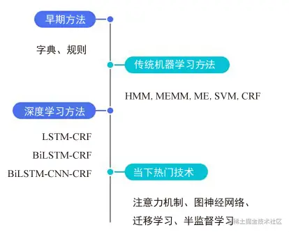 命名实体识别从早期基于词典和规则的方法,到传统机器学习的方法,后来采用基于深度学习的方法,一直到当下热门的注意力机制、图神经网络等研究方法,命名实体识别技术路线随着时间在不断发展,技术发展趋势如图4所示。