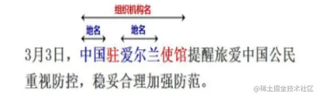 通常要处理的命名实体是非嵌套实体,但是在实际应用中,嵌套实体非常多。大多数命名实体识别会忽略嵌套实体,无法在深层次文本理解中捕获更细粒度的语义信息。如图2 所示,在“3 月 3 日,中国驻爱尔兰使馆提醒旅爱中国公民重视防控,稳妥合理加强防范。”句子中提到的中国驻爱尔兰使馆是一个嵌套实体,中国和爱尔兰均为地名,而中国驻爱尔兰使馆为组织机构名。普通的命名实体识别任务只会识别出其中的地名“中国”和“爱尔兰”,而忽略了整体的组织机构名。