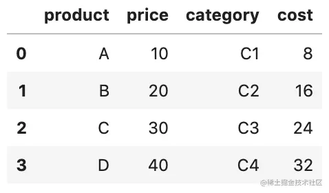df = pd.DataFrame({ 'product': ['A','B','C','D'],