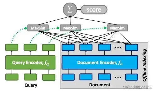 每个查询嵌入都通过 MaxSim 运算符与所有文档嵌入进行交互,该运算符会计算最大相似度(如余弦相似度),并且这些运算符的标量输出会在查询条件中相加。这种范例使 ColBERT 可以利用基于 LMs的深度表示,同时将离线编码文档的成本转移到所有排序文档中,并一次摊销编码查询的成本。