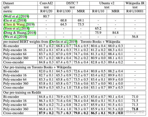 本文选择了检索式对话数据集 ConvAI2、DSTC 7、Ubuntu v2 以及Wikipedia IR 数据集进行实验。负采样方式为:在训练过程中,使用同一个 batch 中的其他 query 对应的 response 作为负样本,而 Cross-encoder 的负采样方式为:在开始训练之前,随机采样 15 个 responses 作为负样本[2]。